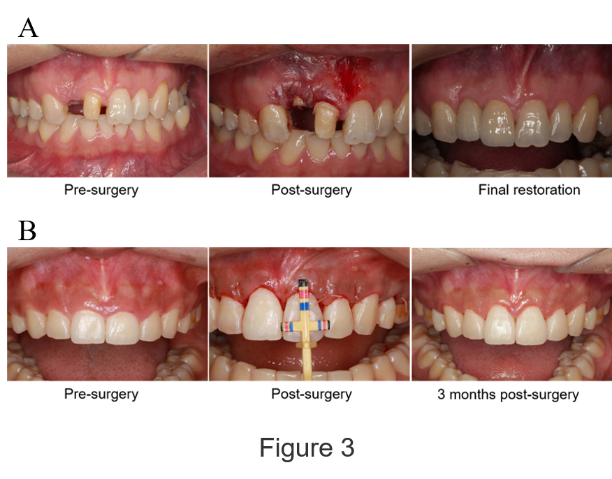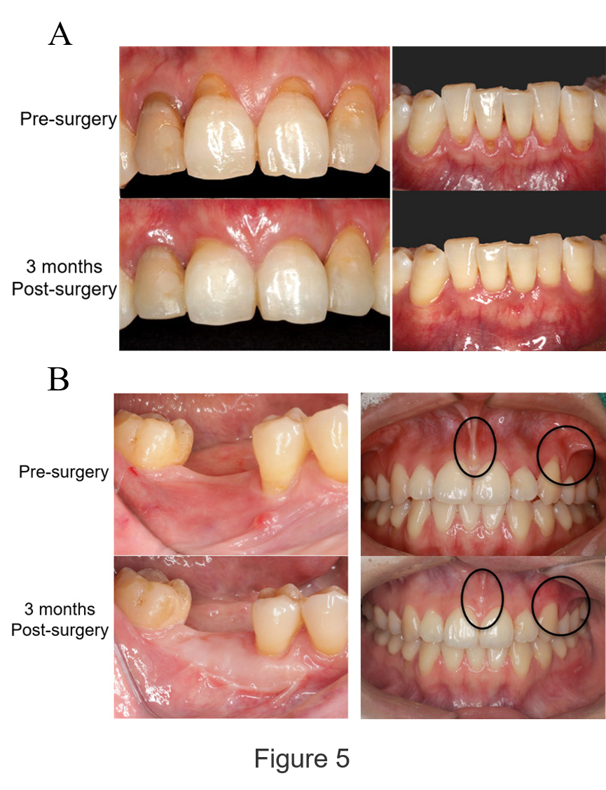 Mucogingival surgeries are widely used to correct aberrant periodontal soft tissues, such as gingival recession (Figure 5A), lack width of keratinized gingiva (Figure 5B, left) and abnormal frenum attachment (Figure 5B, right).