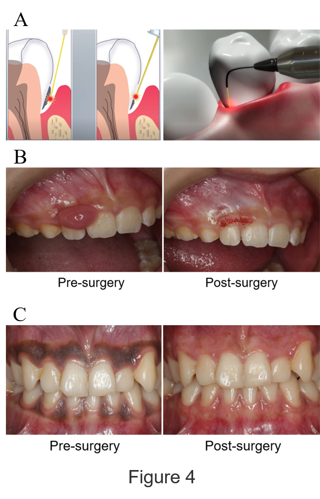 A variety of dental lasers have been used in non-surgical and surgical periodontal therapy including pocket debridement (Figure 4A), excision of epulis (Figure 4B), removal of gingival melanin pigmentation (Figure 4C), etc.
