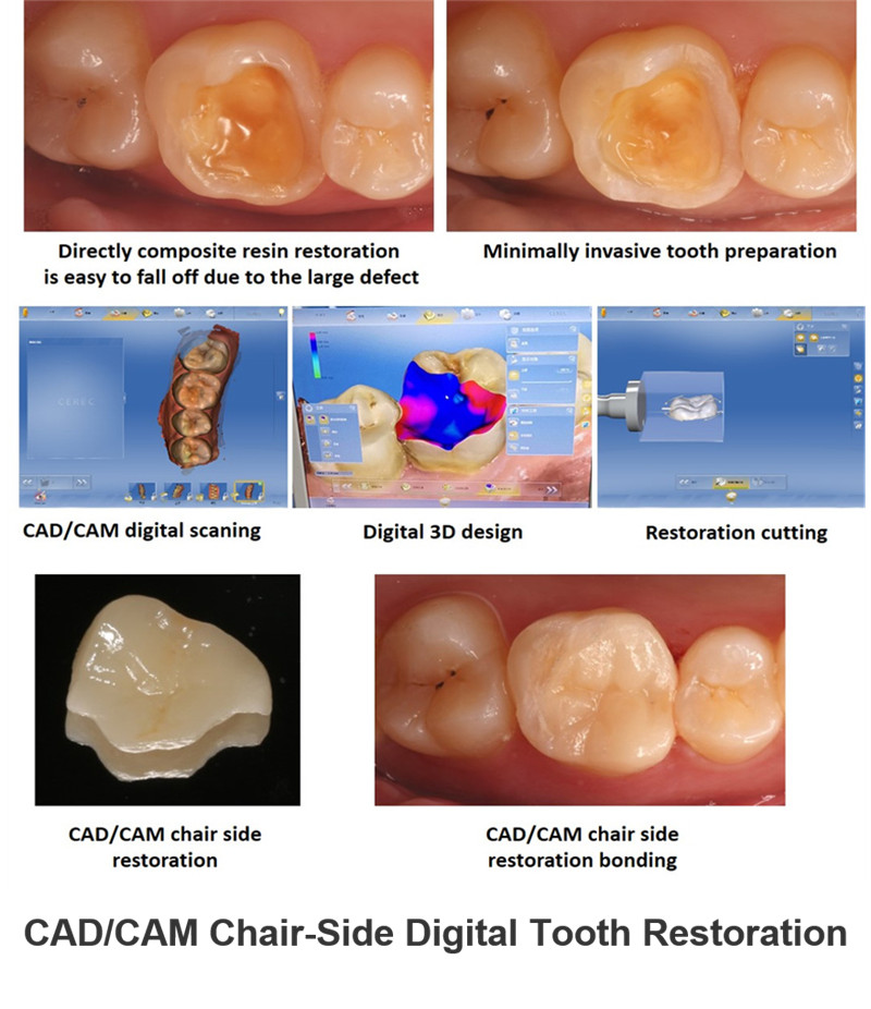 CAD/CAM chair-side digital tooth restoration is a minimally invasive, efficient, aesthetic, and precise system by steps of optical scanning, computer-aided design, rapid milling and immediately acquired restoration. Featured by digitalization and visualization of model generation, restoration and manufacturing process, CAD/CAM improves the curative effect and long-term success rate of dental restoration.