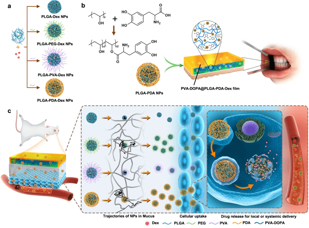 The research team, led by Dr. Qianbing Wan and Dr. Jian Wang, has presented the design of an effective mussel-inspired buccal film with incorporated PLGA-PDA-Dex NPs for improved residence time and mucoadhesion strength. Upon application onto the buccal tissue, the NPs are released gradually from the film and subsequently penetrate the mucus layer and translocate across the epithelium, followed by sustained drug release and improved therapeutic efficacy in treating oral mucositis.