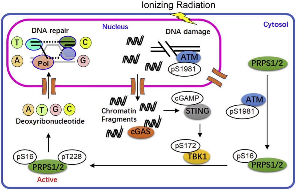 In this study, researchers demonstrated that ATM phosphorylates PRPS1/2 S16 in response to ionizing radiation, which in turn causes PRPS1/2 T228 phosphorylation in a cGAS/STING-axis- and TBK1-dependent manner. T228 phosphorylation activates PRPS1/2 and promotes deoxyribonucleotide synthesis, thereby supporting DNA repair and cell viability.