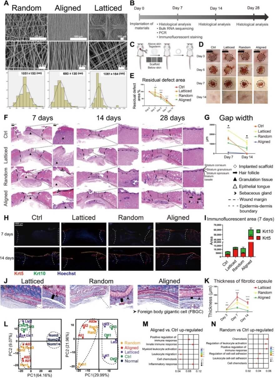 Researchers developed poly(lactic-co-glycolic acid)–fish collagen (PLGA-FC) hybrid electrospun scaffolds with three types of surface topography (random group, latticed group and aligned group). They explored the regenerative outcomes of these scaffolds in rat/mouse dorsal skin excisional wounds and evaluated their immunomodulatory properties. The aligned group displayed an adaptive immunity–dominant response and yielded the most desirable results among three scaffolds. Integrated analysis of three scaffolds suggested that T cells had modulatory effects on wound healing.