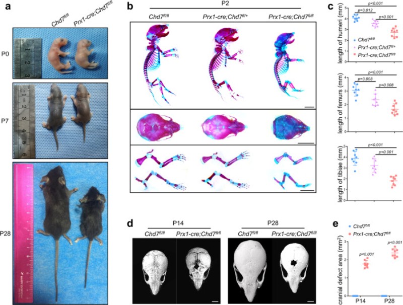 Mutation of CHD7 can cause developmental disorder involving multiple organ system defects, but CHD7’s function and mechanism in skeletal system is fairly defined. The team of professor Ping Gong discovered that conditional knockout of CHD7 in bone marrow MSCs activates the PPAR signaling pathway, which will promote the MSC differentiation balance toward adipogenesis, leading to whole body developmental disorders of the skeletal system, low bone mass, and high marrow adipose tissue. Their research was published in the journal Nature Communications.