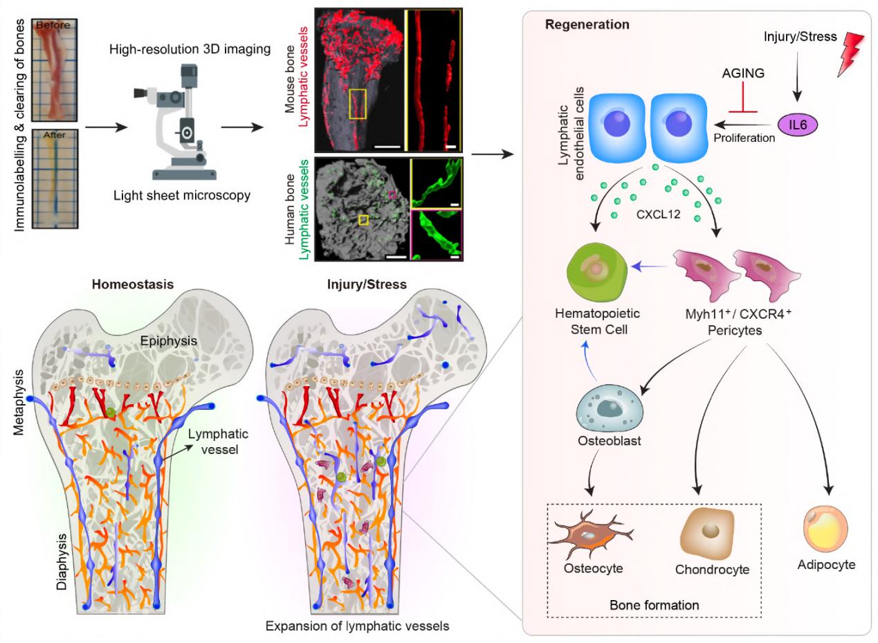 These findings not only demonstrate that lymphatic vessels do exist in bone but also reveal their critical interactions with blood stem cells and perivascular bone stem cells after injury to promote bone regeneration. Thus, lymphatic vessels could be used as a therapeutic pathway to stimulate bone and blood regeneration, presenting important implications for the development of new treatments for bone and circulatory system diseases.
