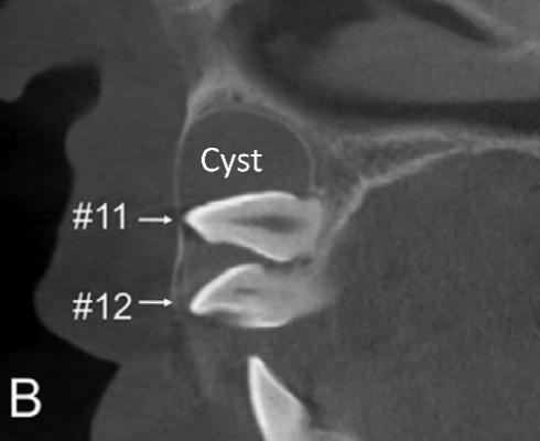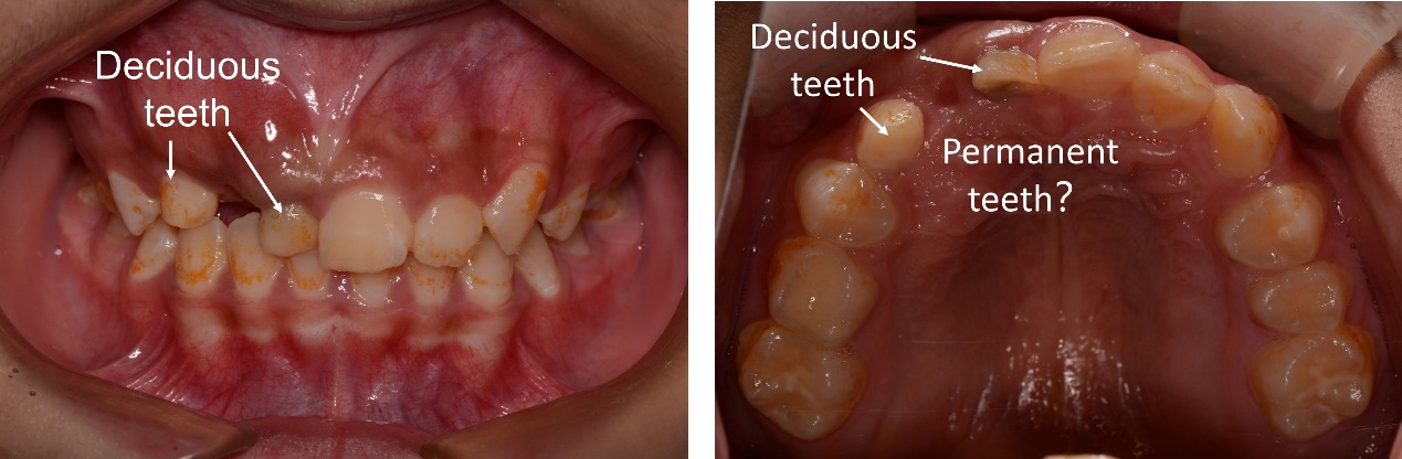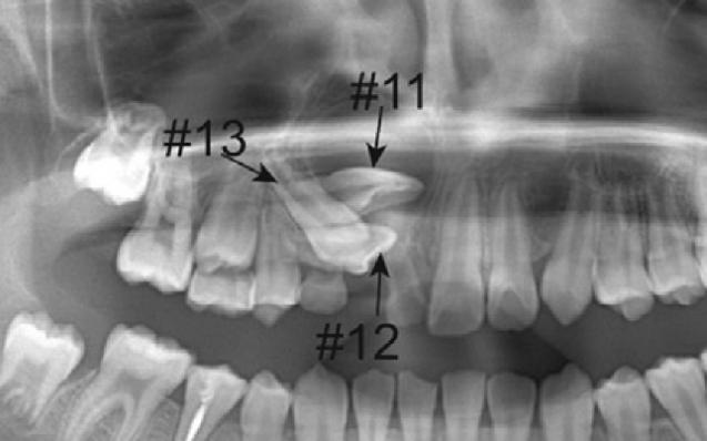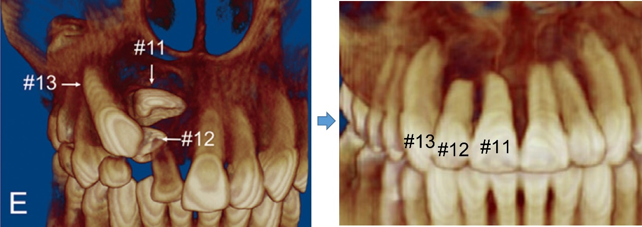 A 11-year-old girl came to our hospital complaining about “missing” front teeth. Radiographs showed that the right maxillary permanent canine, lateral and central incisors were all impacted. Particularly frustrating were the two closely stacked incisors with the roots excursing far away from the right position and embraced in a big cyst. If the incisors could not be drawn and aligned, the girl would have to face a front-teeth-missing adolescence with affected facial esthetics, oral function and self-confidence.